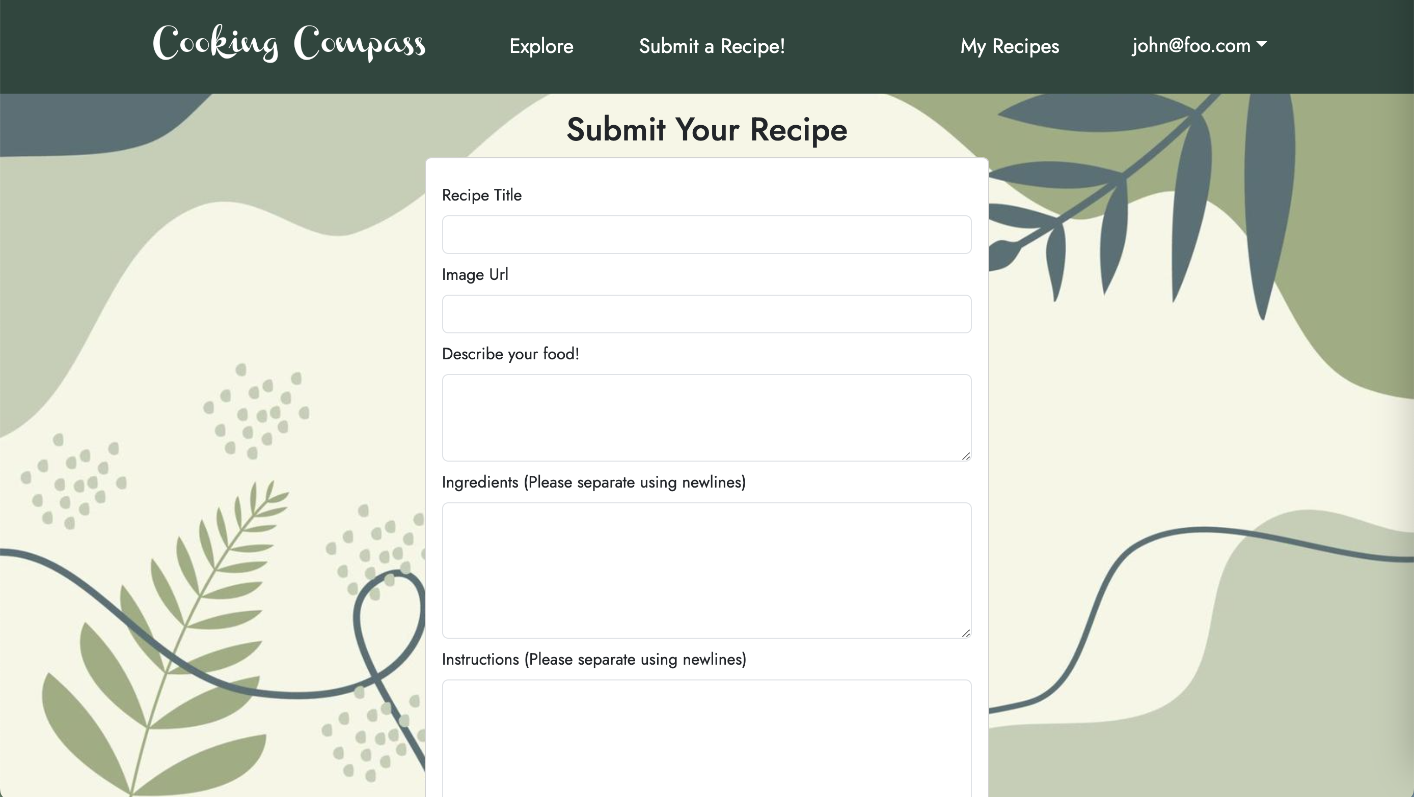 After successfully logging in, the user will be taken back to the homepage, but now they will be able to submit recipes. Clicking on the ‘Submit a Recipe’ link will bring up this page: